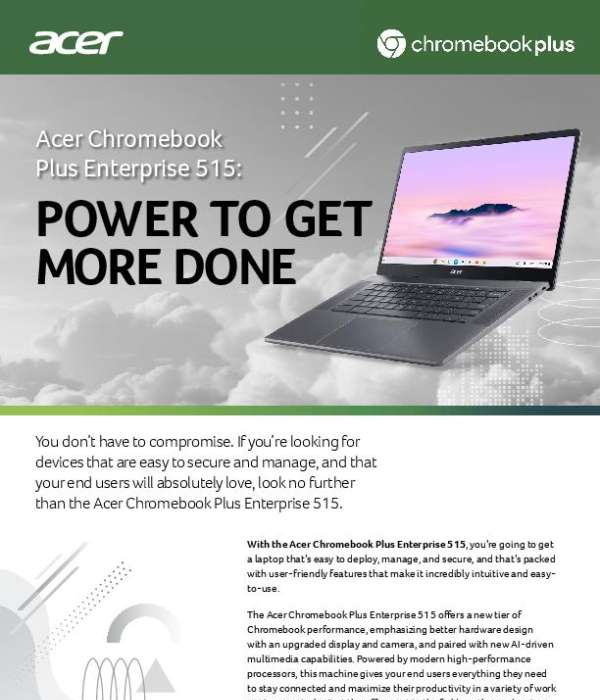 Get ready to supercharge your organization’s productivity with and the Acer Chromebook Plus Enterprise 515! Our benefit-rich eBook reveals how this powerful device can transform your work, simplifying deployment, management, and security. With robust Intel Core processors, lightning-fast multitasking, and up to 10 hours of fast-charging battery life, this Chromebook is designed to keep you efficient all day.