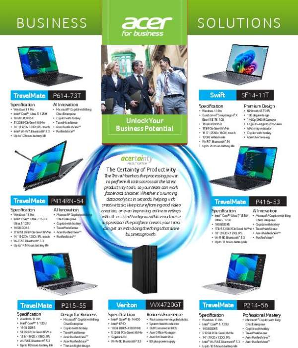 Businesses today need reliable, secure devices built for mobility and modern work. This datasheet outlines Acer TravelMate models equipped with Windows 11 Pro and powered by Intel®, AMD, and Snapdragon® processors — all designed to support security-first organizations with AI-ready innovation. Download and review the specs to see which device best supports your workforce. Then contact White Horse Distribution, LLC to discuss deployment options tailored to your needs.
