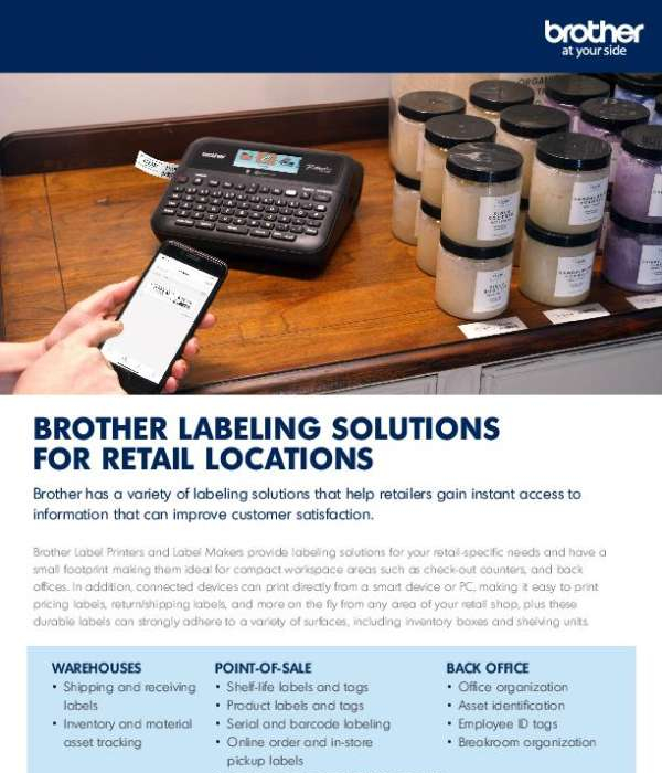 Retailers juggle price labels, shipping labels, and curbside pickup labels. Brother’s label printers make it easy to create durable, accurate labels anywhere in your store from checkout to the back office. This brochure highlights how these compact devices integrate with smart devices and PCs to deliver real-time labels that stick to any surface. Download the brochure to see how you can empower your team to work faster, smarter, and more efficiently. Reach out to White Horse Distribution, LLC to discuss labeling strategies that fit your specific retail environment.