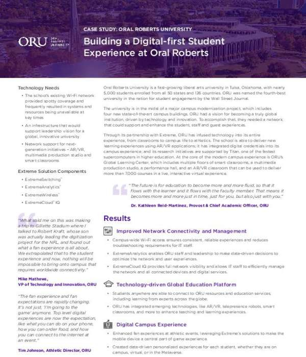 What does a digital-first campus look like in practice? This customer story shows how Oral Roberts University modernized its network to support smart classrooms, AR/VR learning environments, and global connectivity for students and faculty. Read the story to see how a modern network helped deliver reliable campus-wide Wi-Fi and enabled new digital learning experiences.