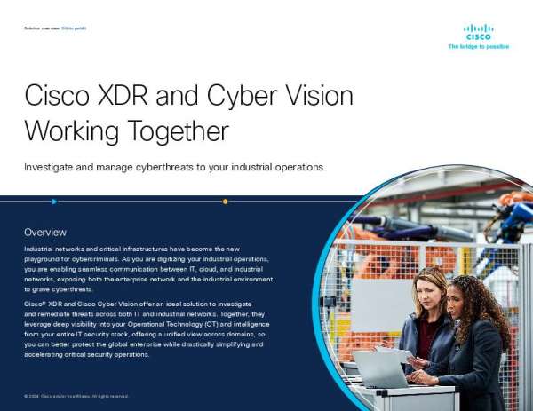 This solution brief provides details on Cisco® XDR and Cisco Cyber Vision, which together investigate and stop threats across both IT and industrial networks.