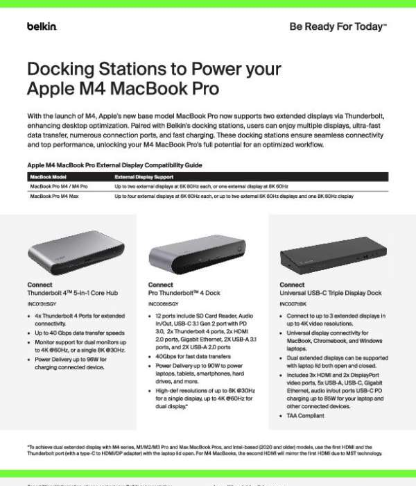 Choosing the right docking station for the Apple M4 MacBook Pro is essential for maximizing performance and connectivity. This comparison guide provides an in-depth look at Belkin’s top docking station models, highlighting features like multi-port support, charging capabilities, and compatibility with the latest Apple devices. Download this guide and equip your workspace with the docking station that best meets your needs. Contact White Horse Distribution, LLC to discuss which model is the best fit for you.