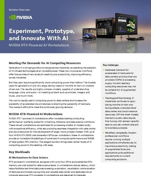 NVIDIA RTX AI workstations offer incredible desktop computing performance — perfectly suited for AI training, inference and data science workflows. This solution brief gives you an overview of workflows managed, main features and benefits, and recommended configurations. Download your copy of the solution brief for the details you need to make an informed decision about the NVIDIA RTX-powered workstation that best meets your AI development needs.