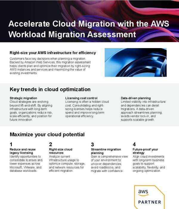 Cloud migration success depends on visibility, cost control, and long-term planning. The one-pager “Accelerate Cloud Migration with the AWS Workload Migration Assessment” outlines how an AWS-backed assessment helps organizations uncover application dependencies, right-size cloud resources, and reduce licensing costs across existing environments. Download the one-pager to see how a data-driven assessment supports confident AWS migrations and scalable cloud strategies, then contact White Horse Distribution, LLC to discuss next steps.