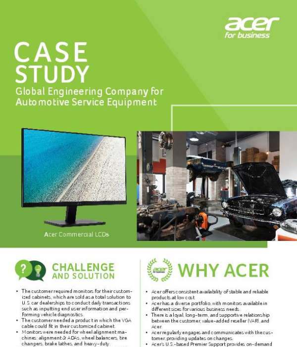 A global engineering company for automotive service equipment needed monitors for their custom-built cabinets and a VGA cable that could fit into the cabinets. Read this brief case study for details on how Acer technology filled the bill with high performance monitors and on-demand, no-script, U.S.-based Premier Support. Contact *$Profile.Organization]* to learn more.