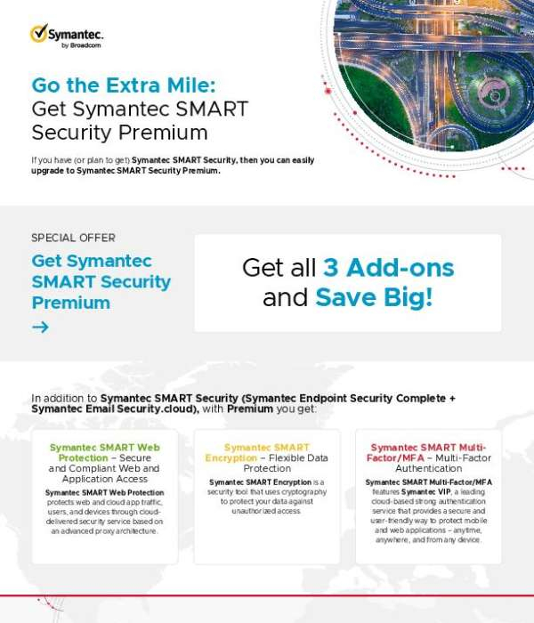 In this datasheet, find details on how Symantec SMART Security Premium can reshape your organization’s security approach with access to advanced features such as Symantec SMART Encryption, Web Isolation, Data Risk-Level Ratings and Cloud Firewall Service. These enhancements not only bolster your organization’s defenses but also drive more ROI with improved efficiency and effectiveness. Download the datasheet and contact us to assess the potential ROI your organization can drive with Symantec SMART Security Premium.