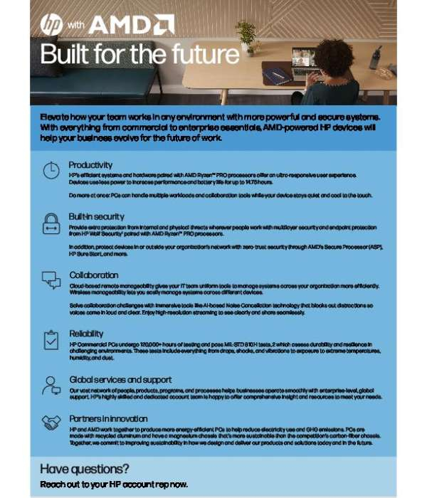 Planning for tomorrow means choosing devices that can adapt. This solution brief outlines why HP PCs powered by AMD are engineered for sustained performance, long-term value, and efficient manageability. Download the brief to understand how these systems deliver forward-looking features for security, sustainability, and productivity. Reach out to White Horse Distribution, LLC to discuss which HP and AMD solution fits your team’s future needs.