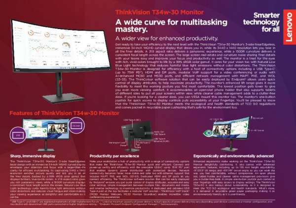 This datasheet focuses on the Lenovo ThinkVision T34w-30 Monitor that presents an immersive visual experience combined with extensive compatibility.