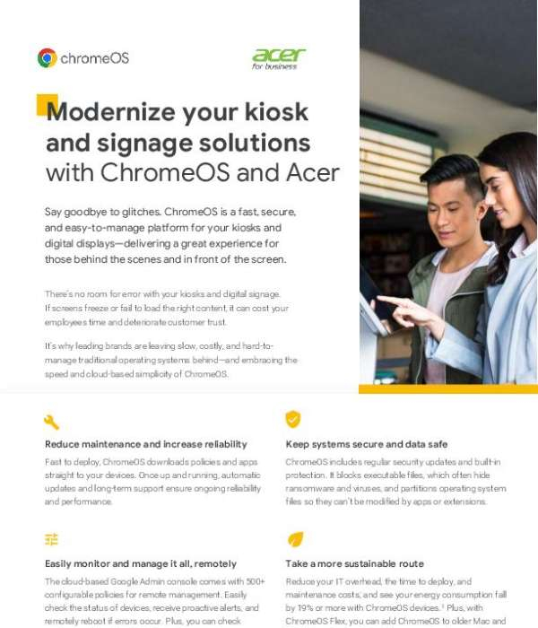 Ready to bid farewell to the glitches that plague so many of today’s kiosk and signage platforms? Say ‘Hello!’ to ChromeOS, the fast, secure, and easy-to-manage platform for kiosks and digital displays that delivers a great experience for those behind the scenes and in front of the screen. Read this solution brief for complete details about how ChromeOS and Acer’s quick deploying, direct-to-devices download policies, automatic updates and long-term support reduce your maintenance costs and ensure ongoing reliability. Modernizing your company’s kiosks and digital displays is just a link away. Click and say “Hello” to cloud-based speed, efficiency, and reliability.