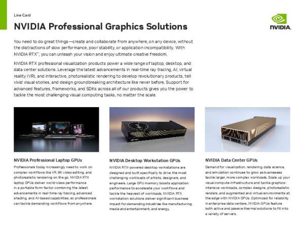 NVIDIA RTX professional graphics solutions include laptop, desktop and data center solutions, all with advanced capabillities including real-time ray tracing, AI, virtual reality and photorealistic rendering. Download the brochure for the details you need to evaluate your choices based on business needs and users.