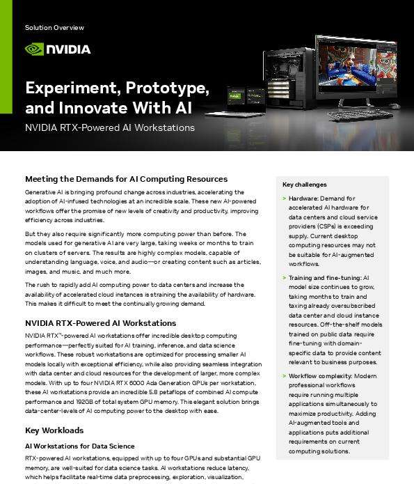 NVIDIA RTX™-powered AI workstations equipped with NVIDIA RTX™ 6000 Ada Generation GPUs provide incredible performance for local desktop AI training and inference work or augmenting data center and cloud resources for larger AI workloads. Download your complimentary copy of this solution brief for an overview of solution features, benefits and the challenges it addresses.