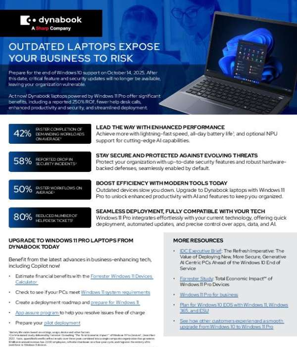 Critical business tech is reaching its limits. The end of support for Windows 10 means organizations relying on older laptops could soon face rising security threats, productivity loss, and costly downtime. This solution brief outlines why refreshing with Dynabook laptops powered by Windows 11 Pro helps you avoid these risks. Download this resource to help you move forward with a smarter refresh strategy, and contact White Horse Distribution, LLC to plan the next steps.