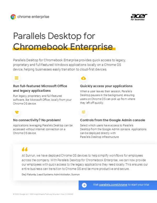 Parallels Desktop for Chromebook Enterprise provides quick access to legacy, proprietary and full-featured Windows applications locally on a Chrome OS device. With Parallels Desktop for Chromebook Enterprise your employees will have quick access to the legacy applications they need locally, ensuring more productive and secure transition to Chrome OS and the cloud.