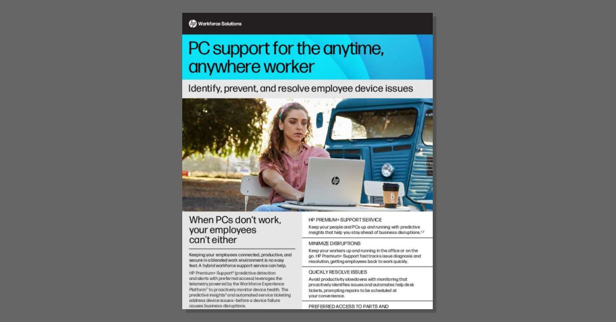 Today’s hybrid employees can’t afford downtime. The solution brief, “PC Support for the Anytime, Anywhere Worker,” shows how HP Premium + Support delivers fast, predictive, and flexible service to prevent disruptions and resolve issues from anywhere. Download the solution brief to see how HP keeps your teams connected and contact White Horse Distribution, LLC to discuss Premium + Support options tailored to your business.