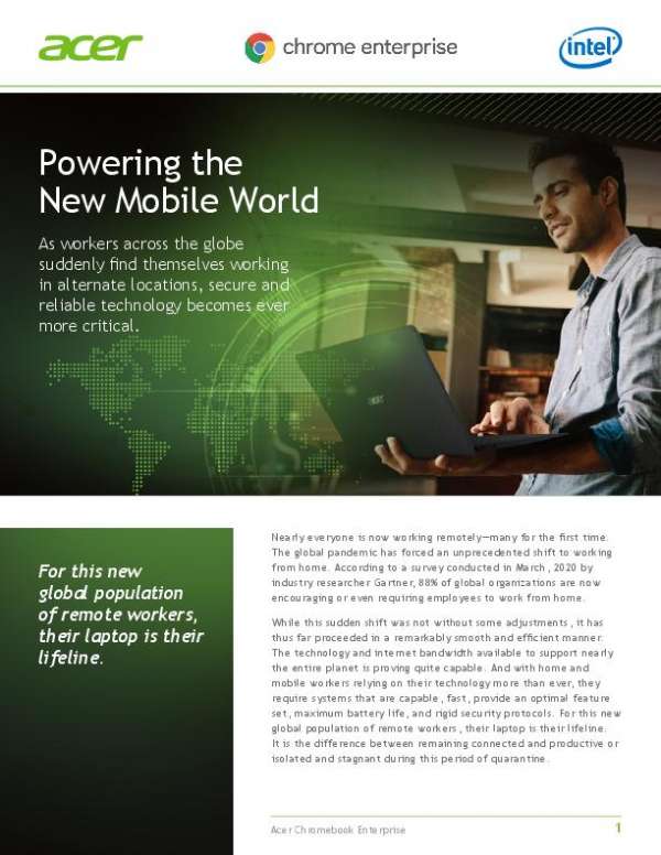 With Acer’s Chromebook Enterprise devices, your on-the-go employees enjoy all the computing power they need to get the job done seamlessly and securely – from anywhere. Download this solution brief to explore the challenges and opportunities workers worldwide face in our new mobile world and how Acer Chromebook Enterprise devices help address them.