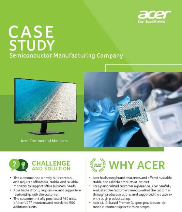 Semiconductor manufacturing company turns to Acer for their monitor needs.