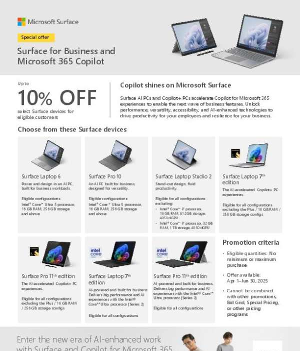 Business leaders want results from AI, not just hype. This flyer shows how Surface for Business devices and Copilot+ PCs are built to maximize the impact of Microsoft 365 Copilot. Check it out to see how the hardware and software work together to deliver performance, security, and AI features that help employees work smarter and adapt faster. Contact White Horse Distribution, LLC to talk through options for your team.