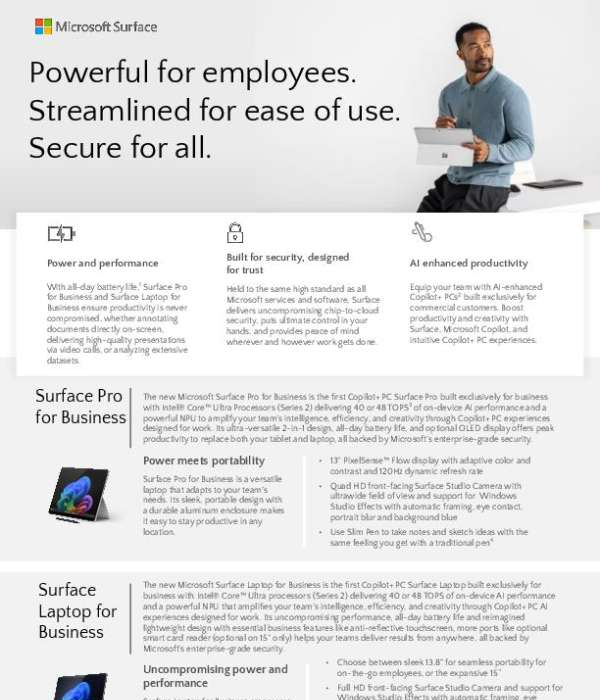 The new Surface Pro for Business is more than a 2-in-1 — it’s the first Surface Copilot+ PC built for modern work. With Intel® Core™ Ultra processors, all-day battery life, an optional OLED display, and Microsoft enterprise-grade security, this flyer highlights what makes it the right fit for high-performance, AI-enhanced productivity. View the flyer to see how Surface empowers your workforce and reach out to White Horse Distribution, LLC for expert advice on deploying Copilot+ PCs in your environment.