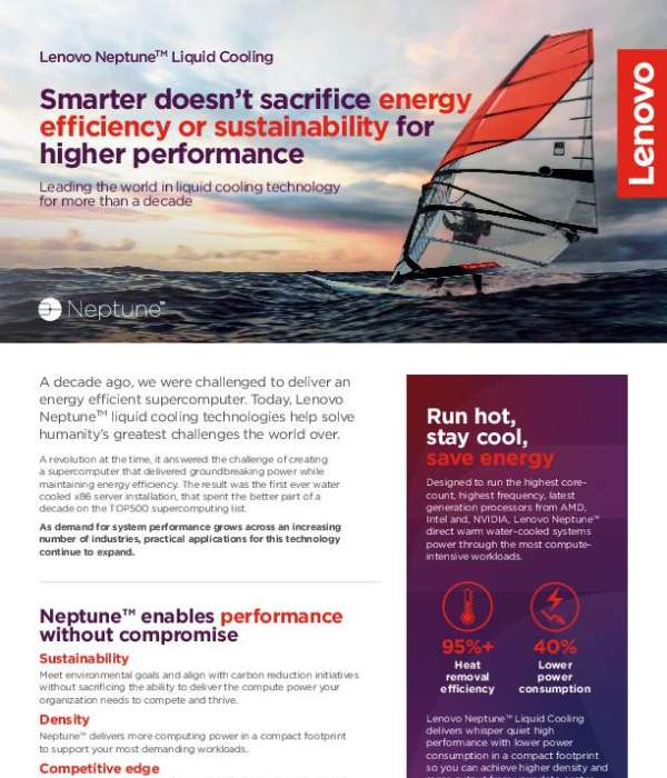 Lenovo’s ThinkSystem SC777 V4 Neptune is the embodiment of performance and efficiency, designed to empower exascale computing to everyscale. Leading in liquid-cooling technology for over a decade, Lenovo’s Neptune system revamps the concept of HPC. As explained in the document, unlike traditional systems, Neptune delivers not only power but also exceptional energy efficiency. With its ground-breaking liquid cooling technology, it offers the capability to run the highest core counts and the highest frequency from AMD, Intel, and NVIDIA processors, powering through the most compute-intensive workloads, while maintaining a compact footprint and reduced power consumption. Connect with us to transform your computing landscape.