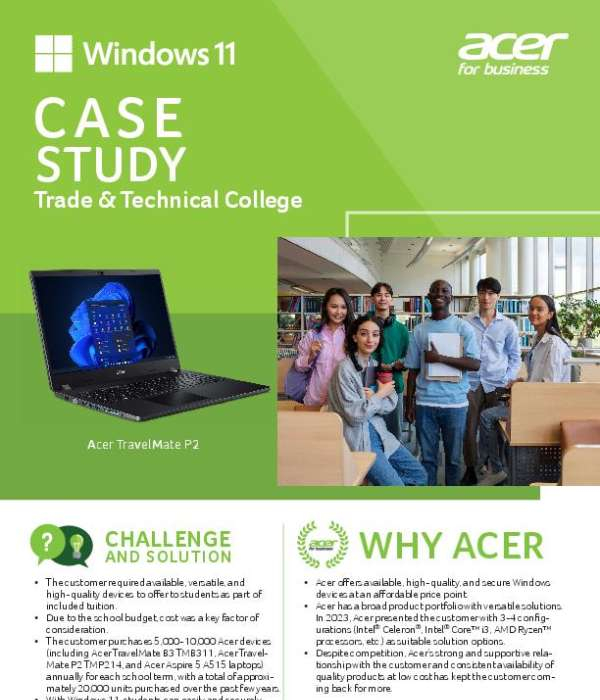 Budget pressure and the need for reliable, student-ready tech can put trade and technical colleges in a bind. This case study shows how one institution solved that problem by deploying thousands of Acer TravelMate laptops each year as part of tuition. The study explores how affordability, availability, and versatility made Acer the long-term provider of choice. Read the case study to learn how your organization can offer secure, cost-effective devices and contact White Horse Distribution, LLC for a customized device consultation.