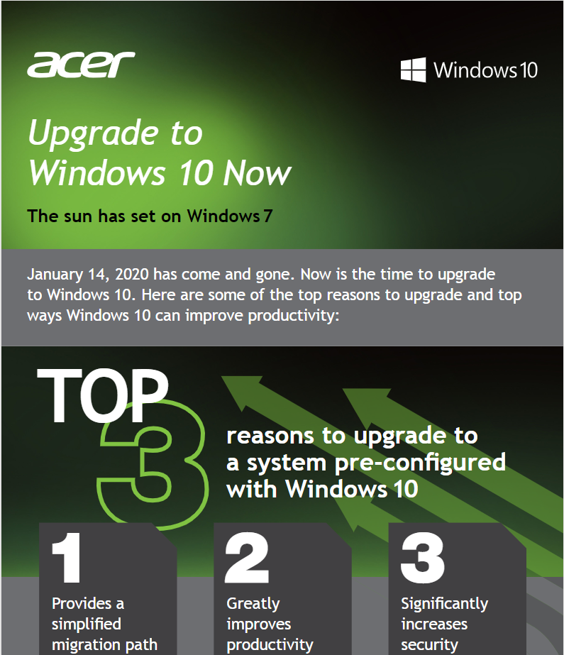 Windows 7 is no longer supported by Microsoft and it is long past time to upgrade to Windows 10. Check out the infographic for the top reasons why upgrading to Acer Business pre-figured for Windows 10 devices, like the TravelMate P6, can boost your enterprise’s performance and greatly improve security.