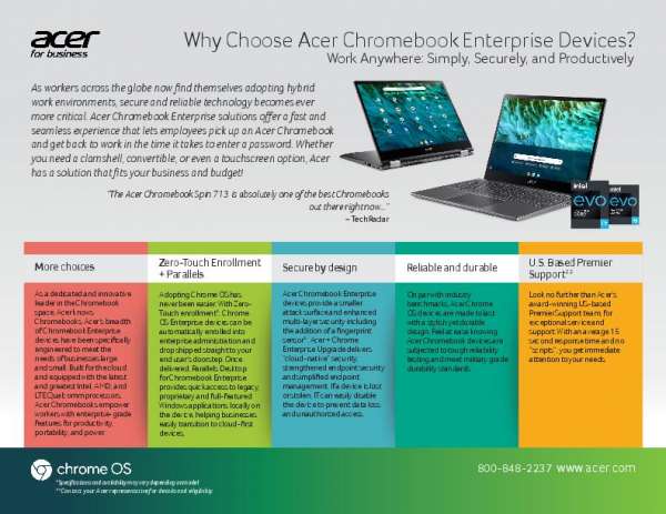 Acer Chromebook Enterprise solutions offer a fast and seamless experience that lets employees pick up an Acer Chromebook and get back to work in the time it takes to enter a password. Whether you need a clamshell, convertible, or even a touchscreen option, Acer has a solution that fits your business and budget!